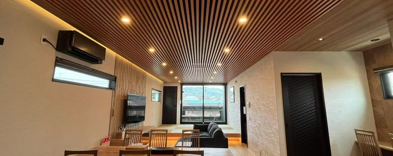 太宰府駅から徒歩8分、五条駅から徒歩6分、新築で木の素材を活かした和モダンデザイン、梅の由 竹ノ屋 4ベッドルーム、2バスルームを完備、バスルームのお風呂は美泡湯を採用、マイクロバブルを発生させてお湯はトロトロ仕様の乳白色に変わります。